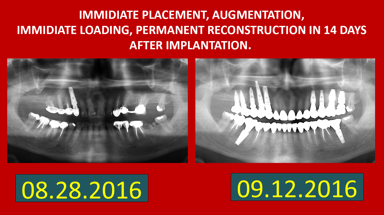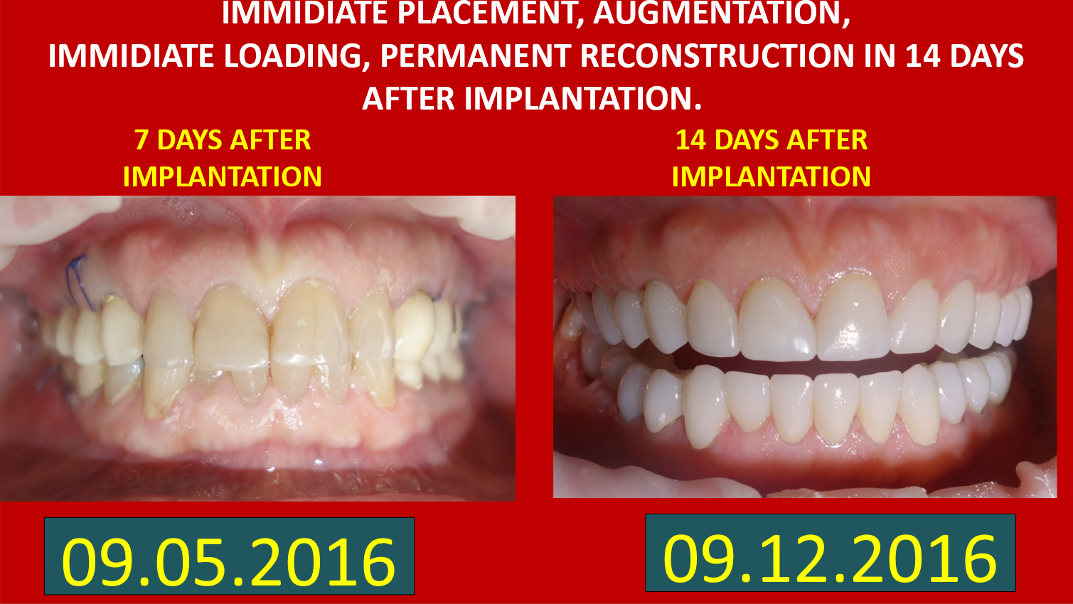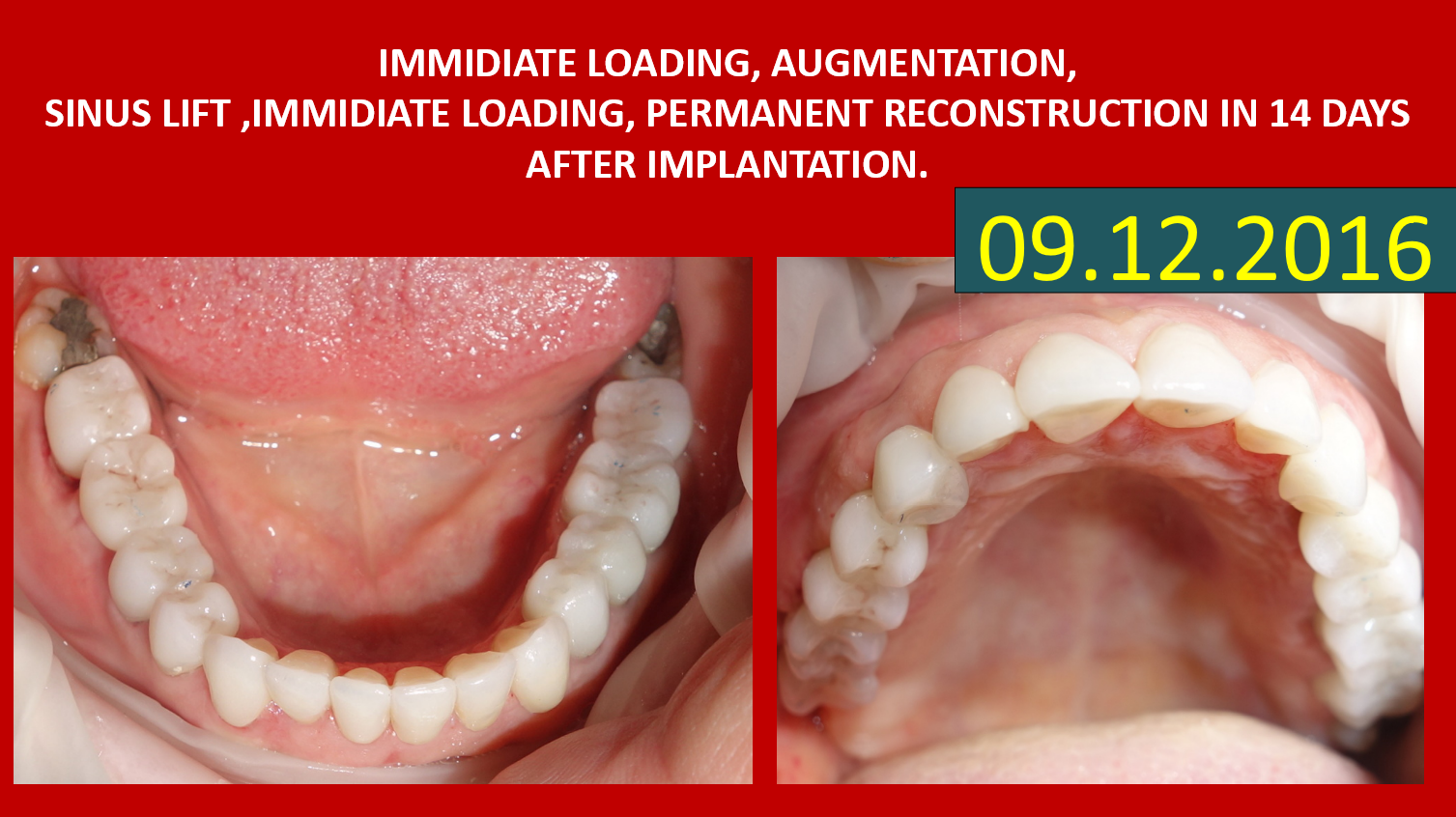 Immidiate placement, sinus lift, augmentation, immidiate loading, final restoration in 14 days.