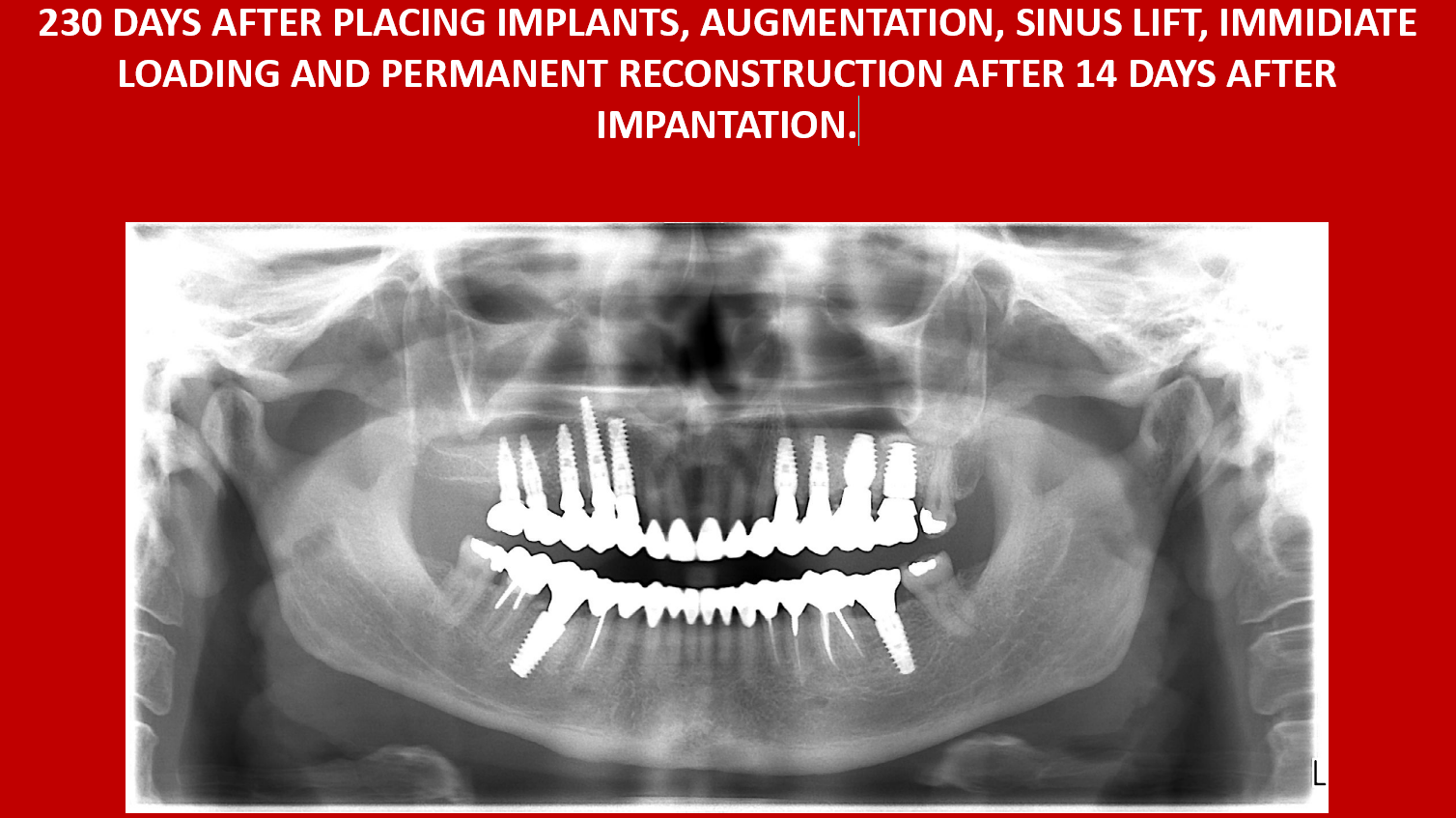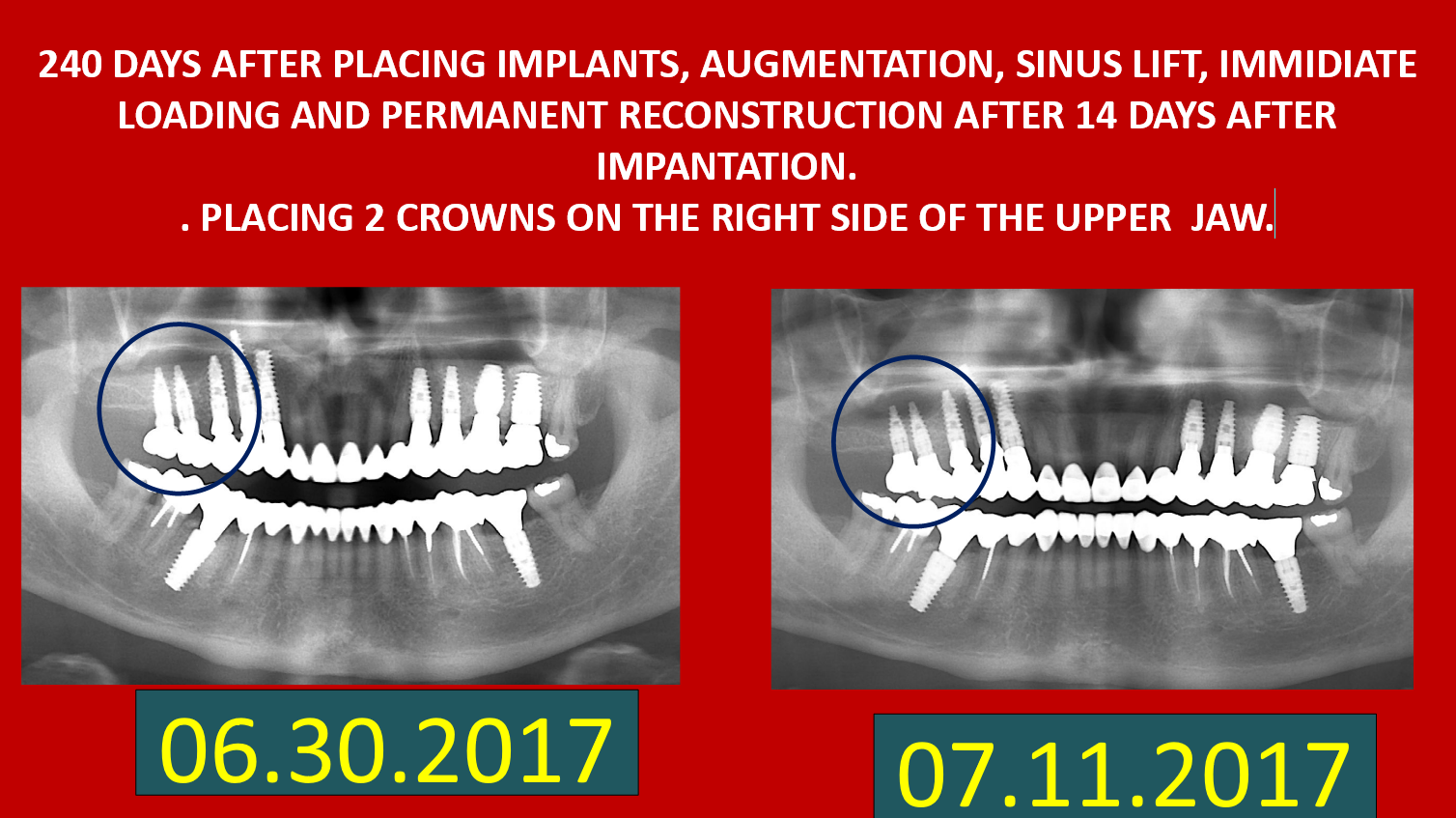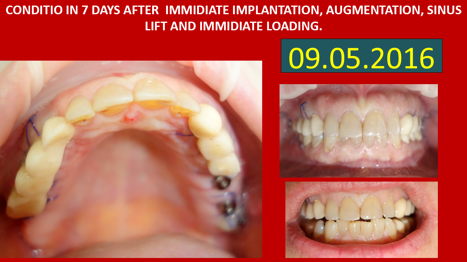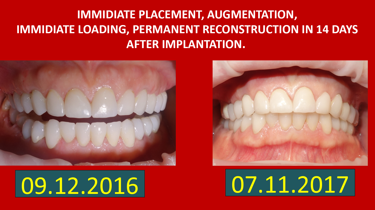Immidiate placement, sinus lift, augmentation, immidiate loading, final restoration in 14 days.
